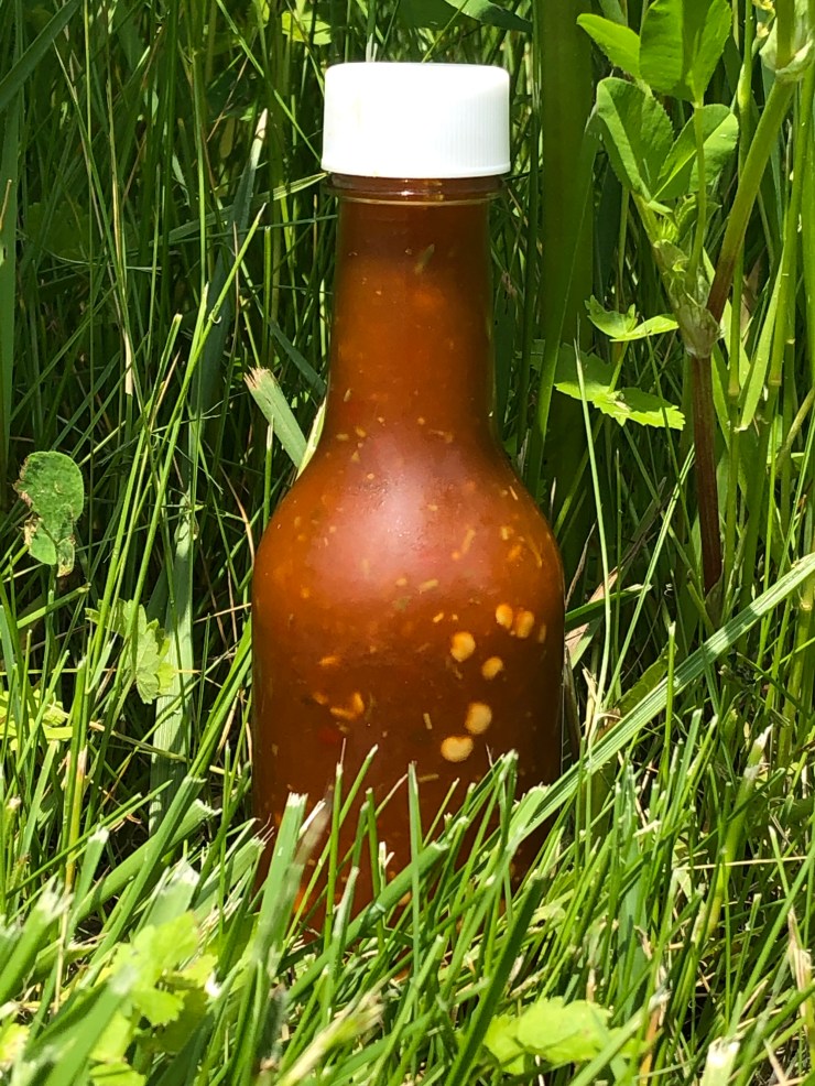 We let a variety of superhots (ghost peppers, scorpions, etc.) and little red chilis develop flavors for nine months, then added fermented wild leek greens and apple cider vinegar infused with spruce tips, garlic mustard greens and rhizomes, bee balm and field garlic greens–the wonderful flavors of spring.